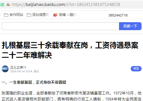 基层职工的奉献不该被辜负,明确的政策应落到实处,官方的承诺不该被拖延。张国强的遭遇看似个人待遇问题,实则关乎政策执行严肃性、基层治理公信力与劳动者获得感。事实清晰、依据充分、责任明确,长期搁置既伤害当事人,也损害政策权威与公平。每一位基层劳动者都应被尊重,每一项合法诉求都该被正视。愿这场二十二年的权益悬案早日解决,让老人安享晚年,让付出被认可,让公平落地。